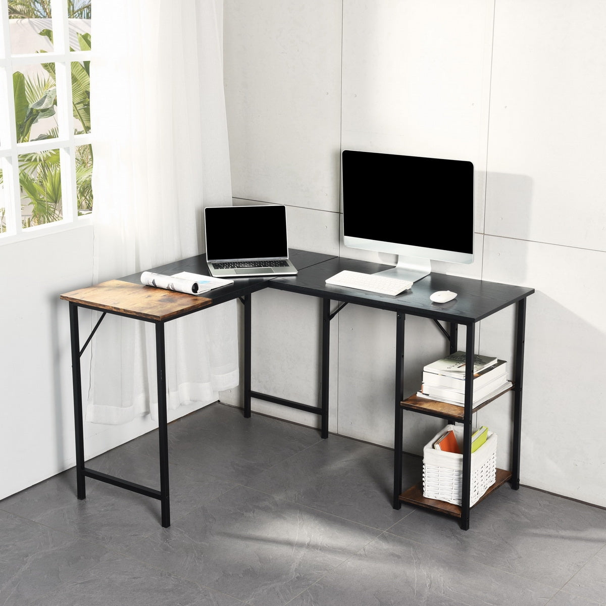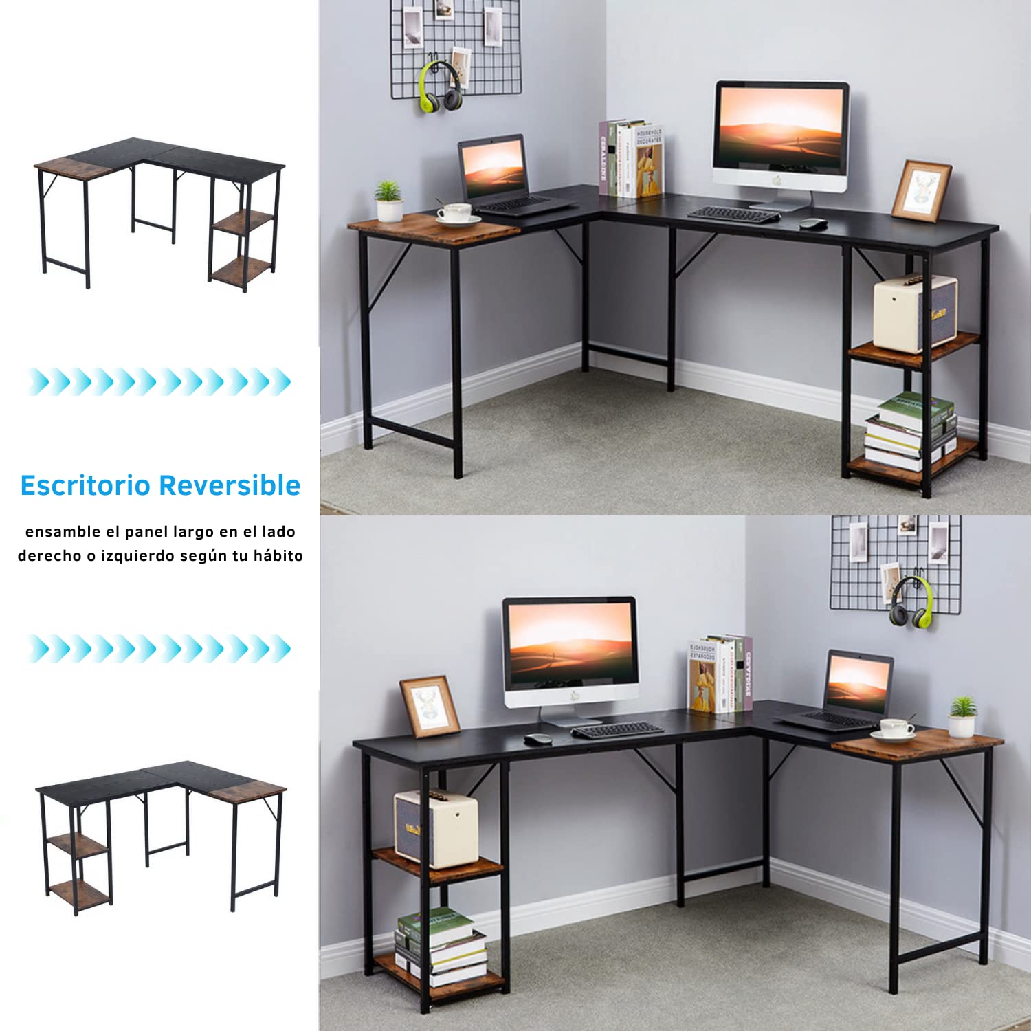 - 【ESTRUCTURA RESISTENTE】 El escritorio en forma de L con estantes ajustables está compuesto de tableros de partículas de alta calidad y un marco de metal negro para garantizar la estabilidad y robustez. Esta estación de trabajo para escribir en la oficina tiene almohadillas para los pies ajustables para satisfacer las necesidades de diferentes alturas.